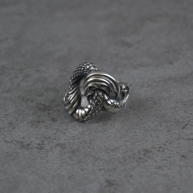 【受注生産品】 こちらの商品は、オーダーをいただいてからの生産のため、お手元にお届けするまで3週間程度お時間をいただいております。ご確認のうえでご購入いただきますようお願いいたします。 蛇の交尾している様子から着想を得たリングです。 シンプルながら細やかに彫刻された鱗、交尾を擬した注連縄へと変化していくユニークなデザインを取り入れました。 LMR138との重ね着けも相性良しです。 素材:925 HD 8*6mm ※希望のリングサイズ(#5~30)を購入手続きの備考欄に記入ください。 ※表記外のリングサイズ、カスタマイズ等はお問合せください。