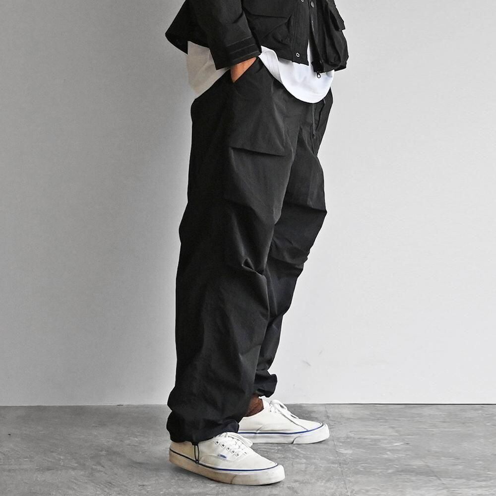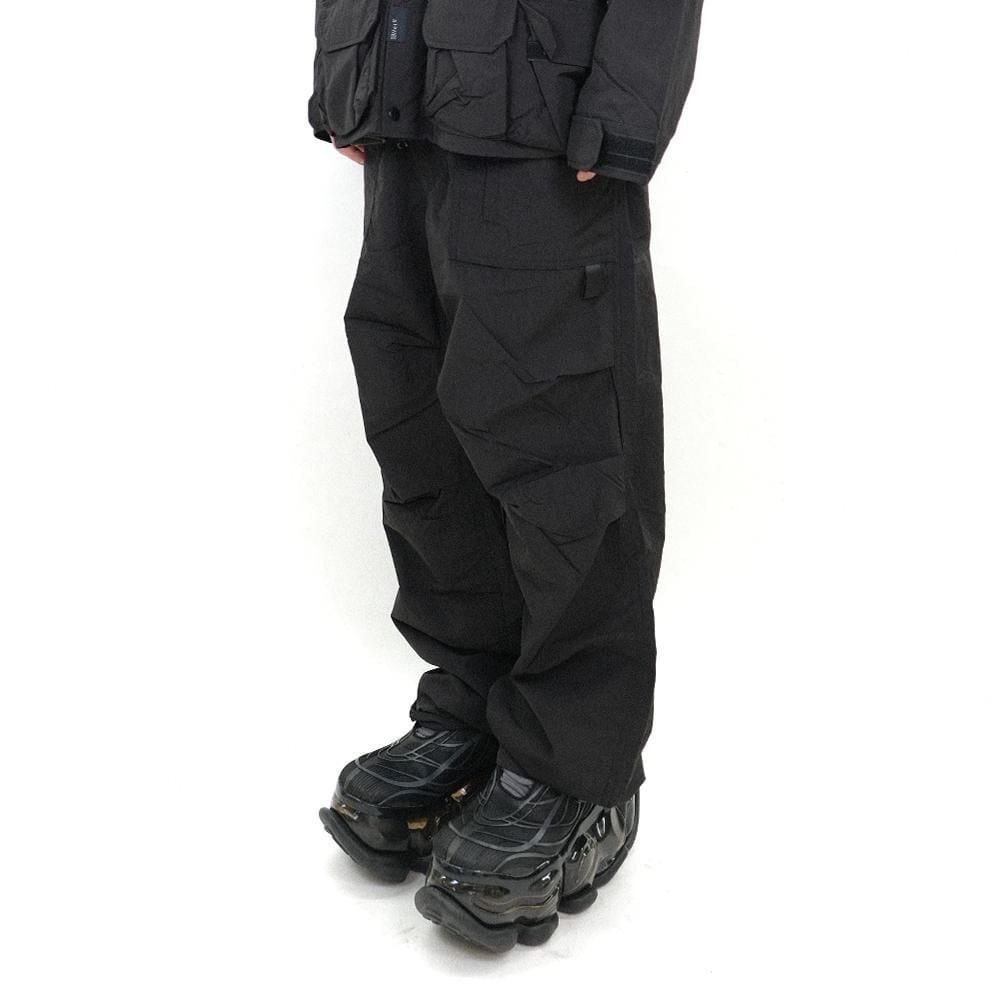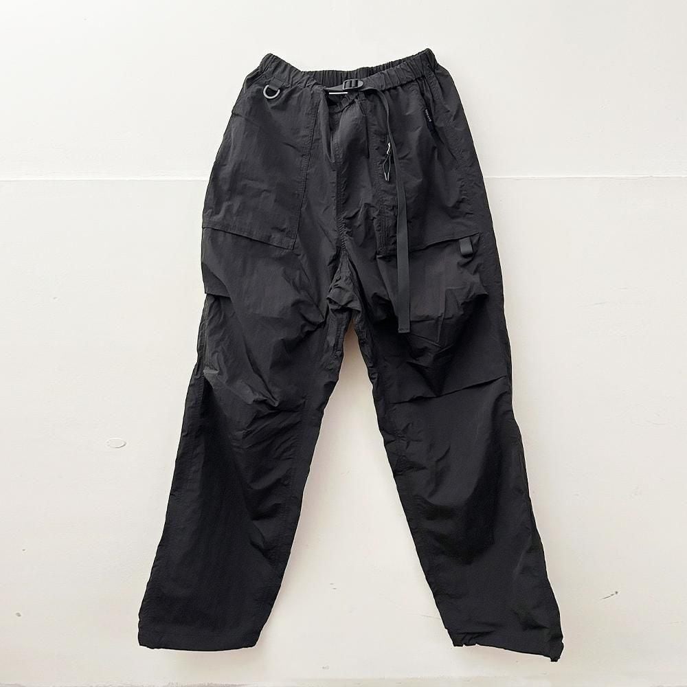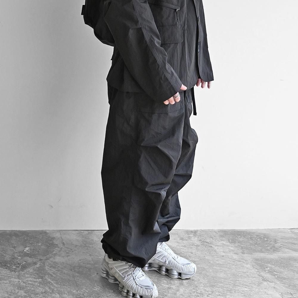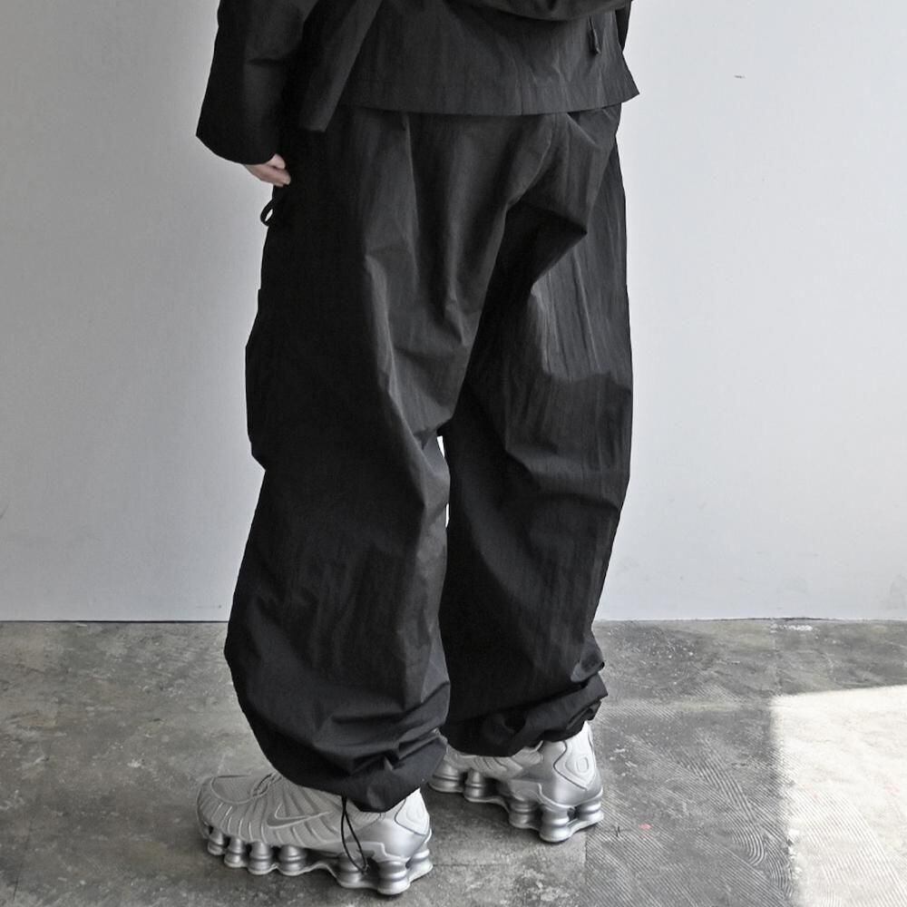 構築的なポケットデザインと立体感のあるシルエットが特徴のナイロンパンツ。