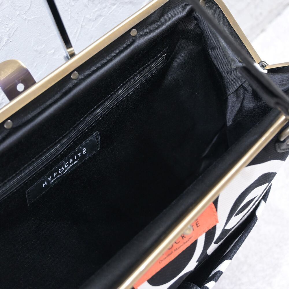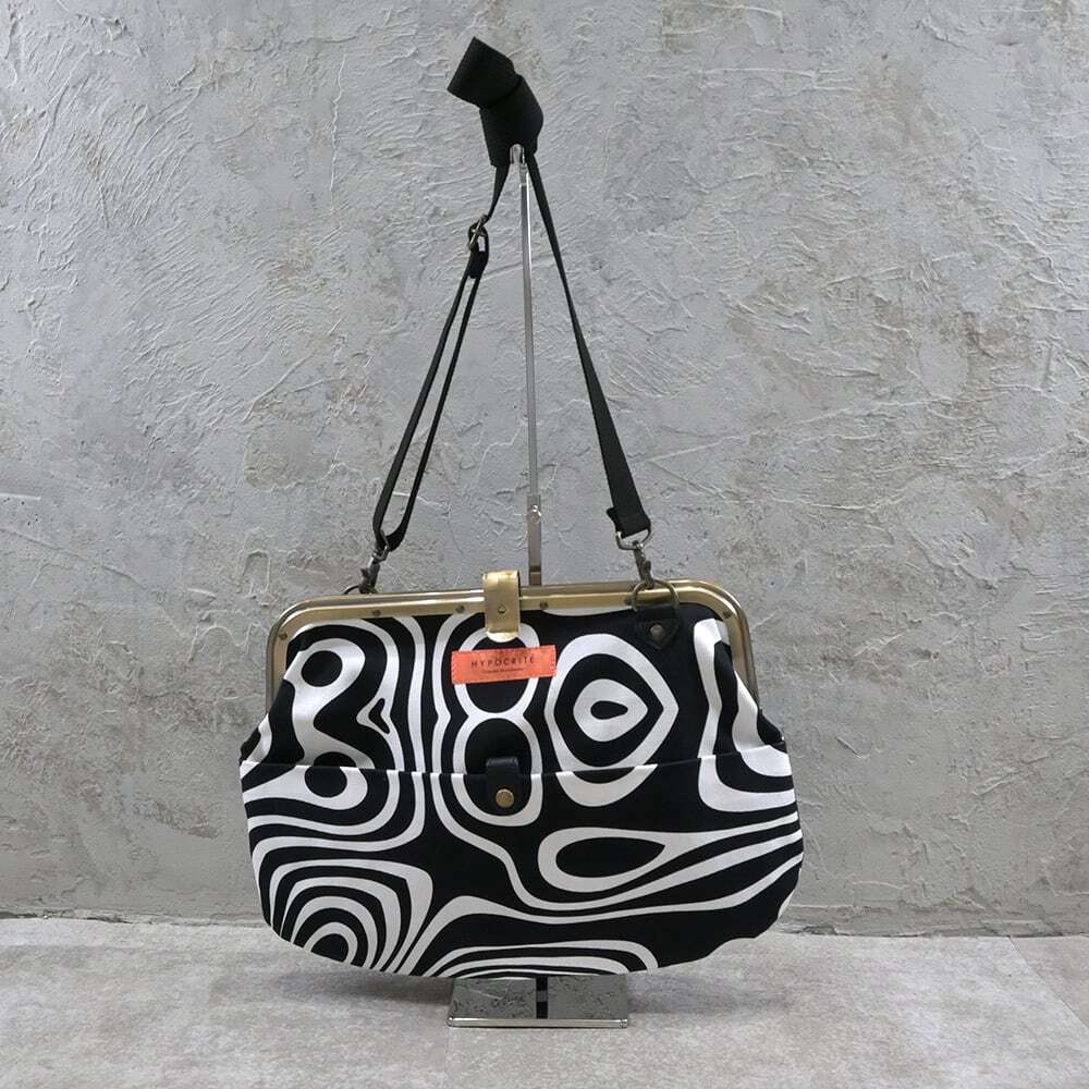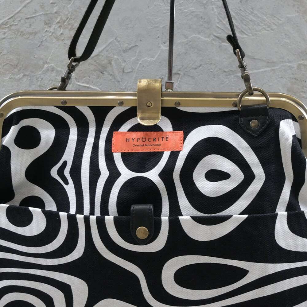 定番タイプのがま口レザーショルダーバッグからHYPOCRITE を象徴する【DEAD OF PSYCHEDELICKER】柄のテキスタイルを全面使用。ヘヴィーツイルでタフな作りの【がま口タイプ】のカバンはレディースライクなデザインをメンズでも使えるようなディテールワークで仕上げています。質感と機能性にフォーカスを置き外側に両面ポケット、中にも両面しきりポケットやジップ付きポケットがあり収納性抜群の作りで仕上げています。インパクトを放つデザインながらデイリーユースな素材感があるおすすめの品番です。